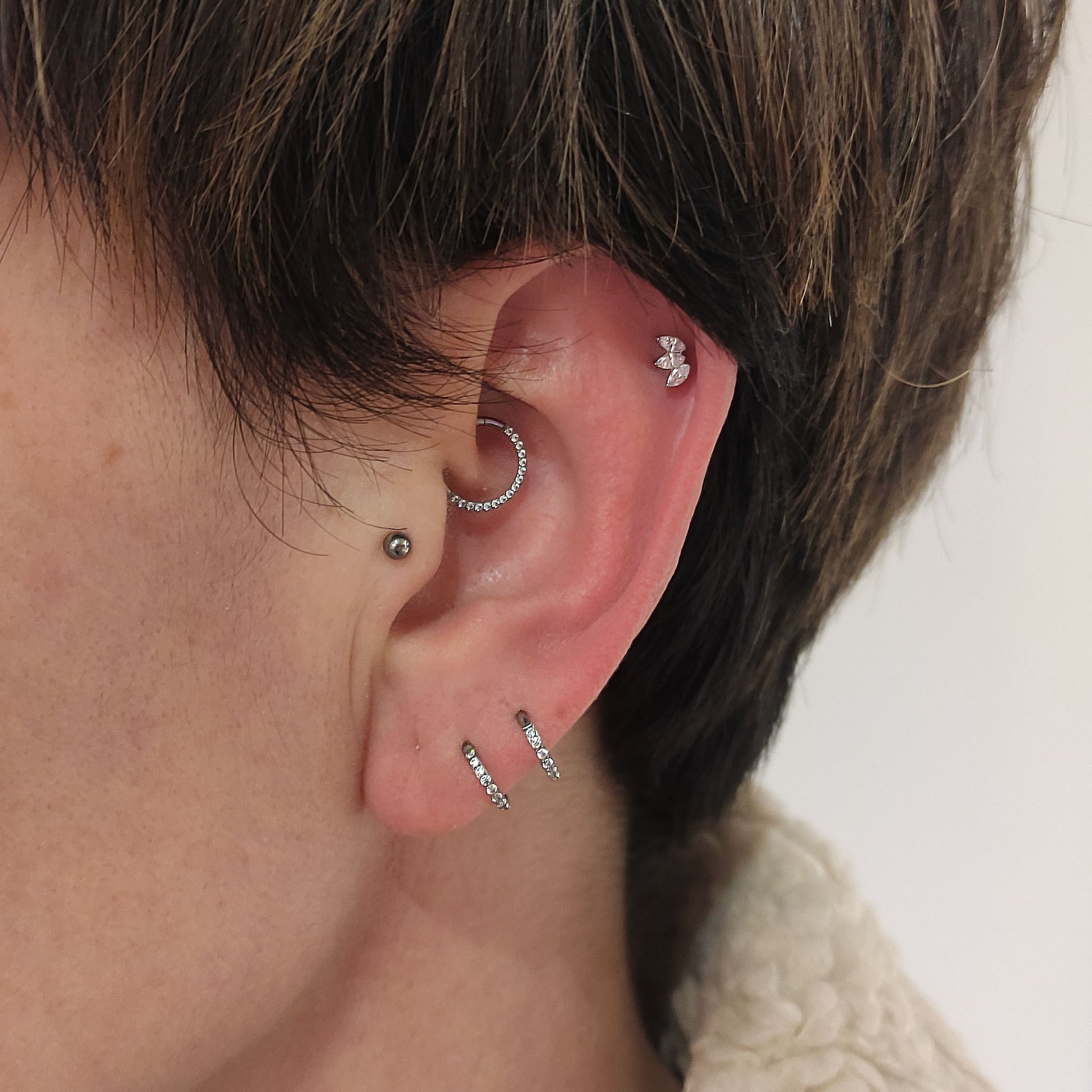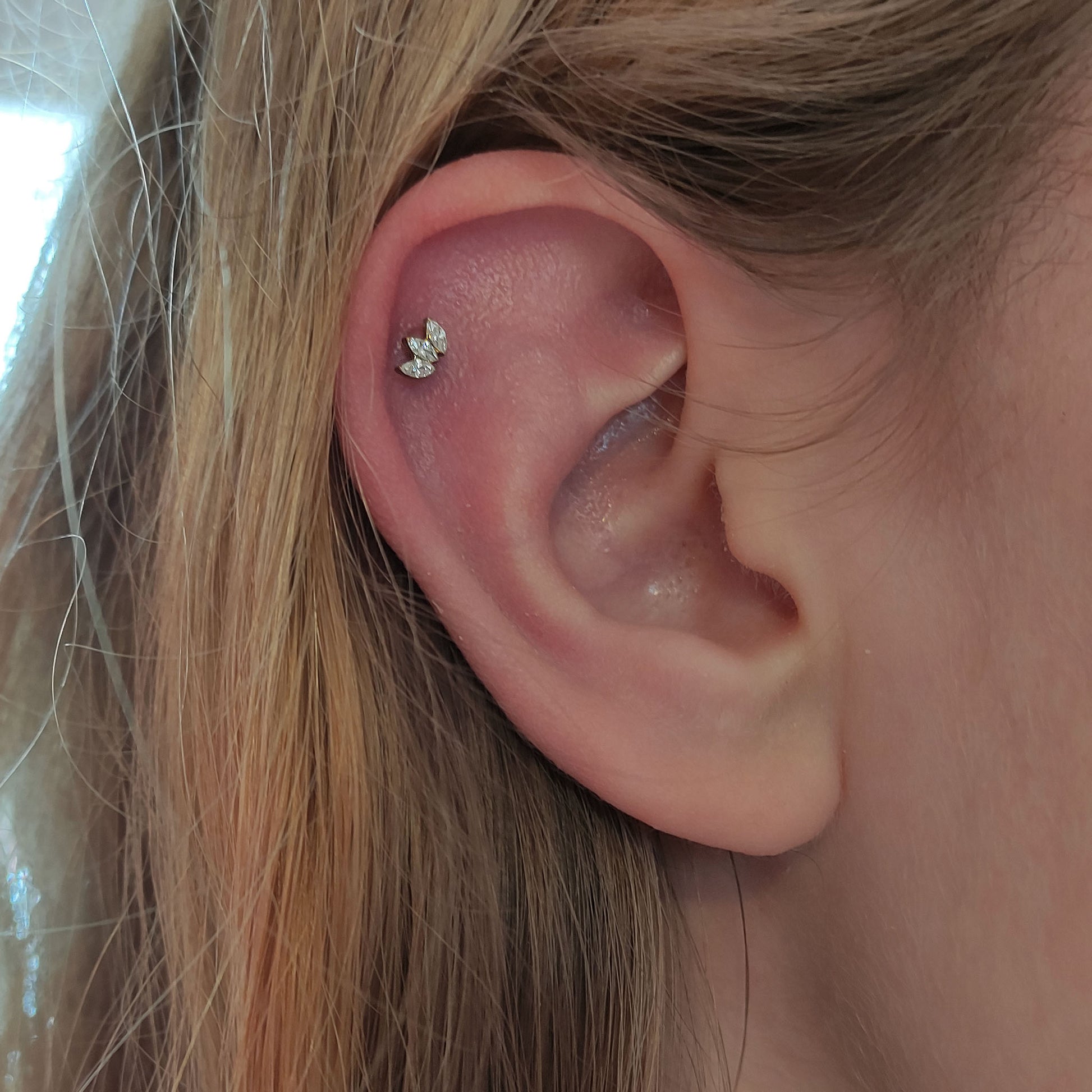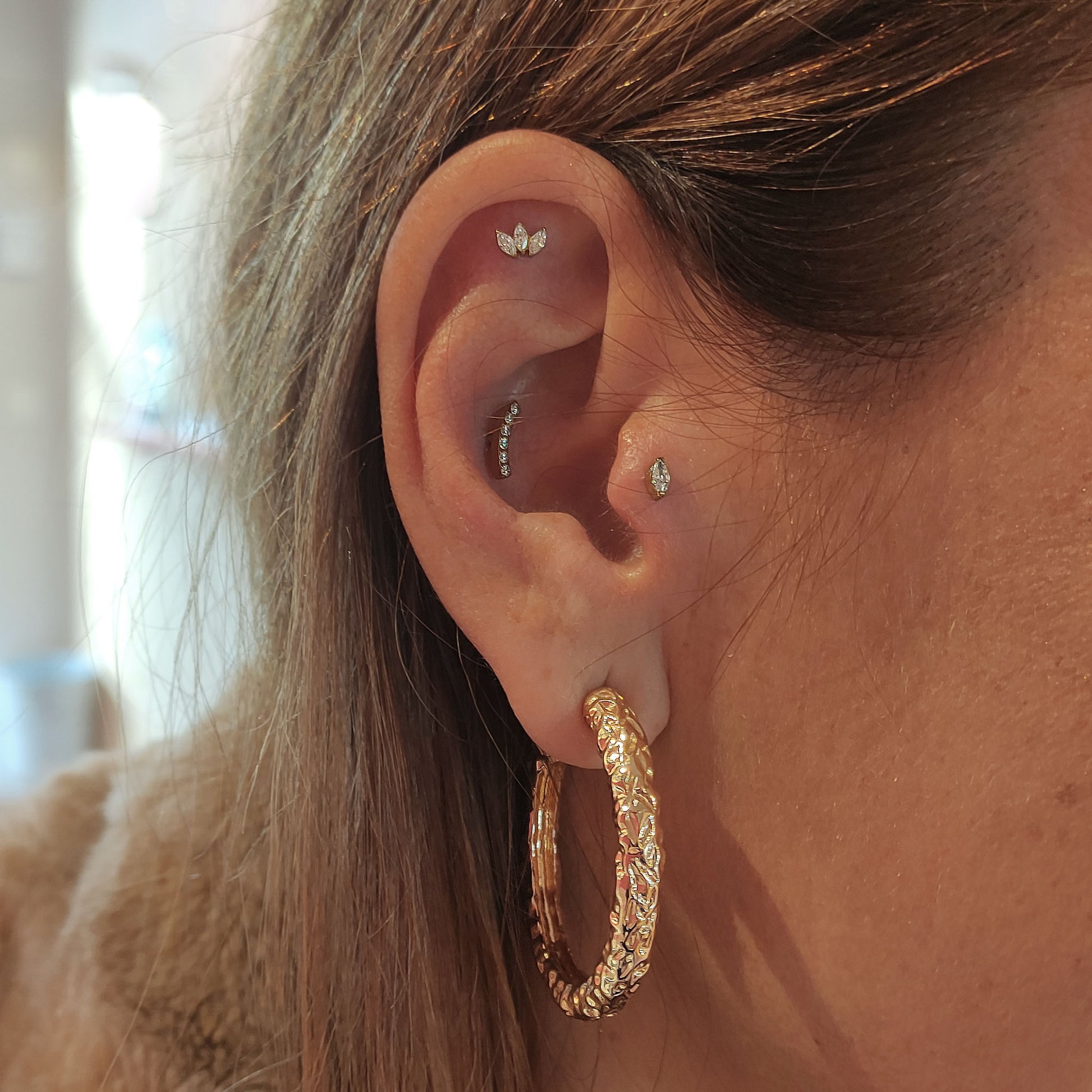 Three oval-cut zirconia stones form this tiny crown to wear on your favorite piercing. Comfortable to wear thanks to its Certified Titanium structure, internal thread, and flat back. Available in gold and silver finishes.