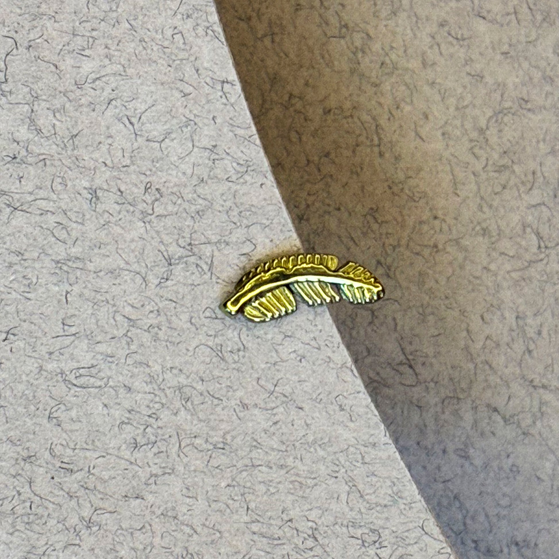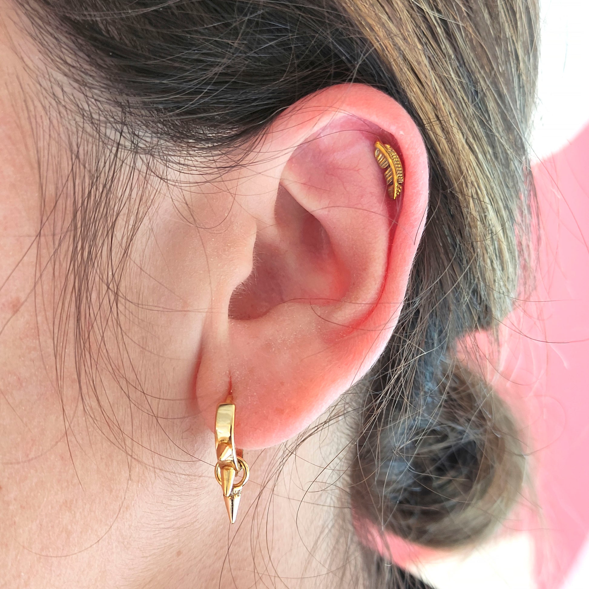 A delicate feather-shaped piece that brings a subtle boho vibe to your ear stack. Perfect for the lobe, helix or flat, and beautiful when combined with minimalist studs or sparkling pieces. Made of certified titanium with an internal thread and flat back for comfortable wear. Available in gold and silver.