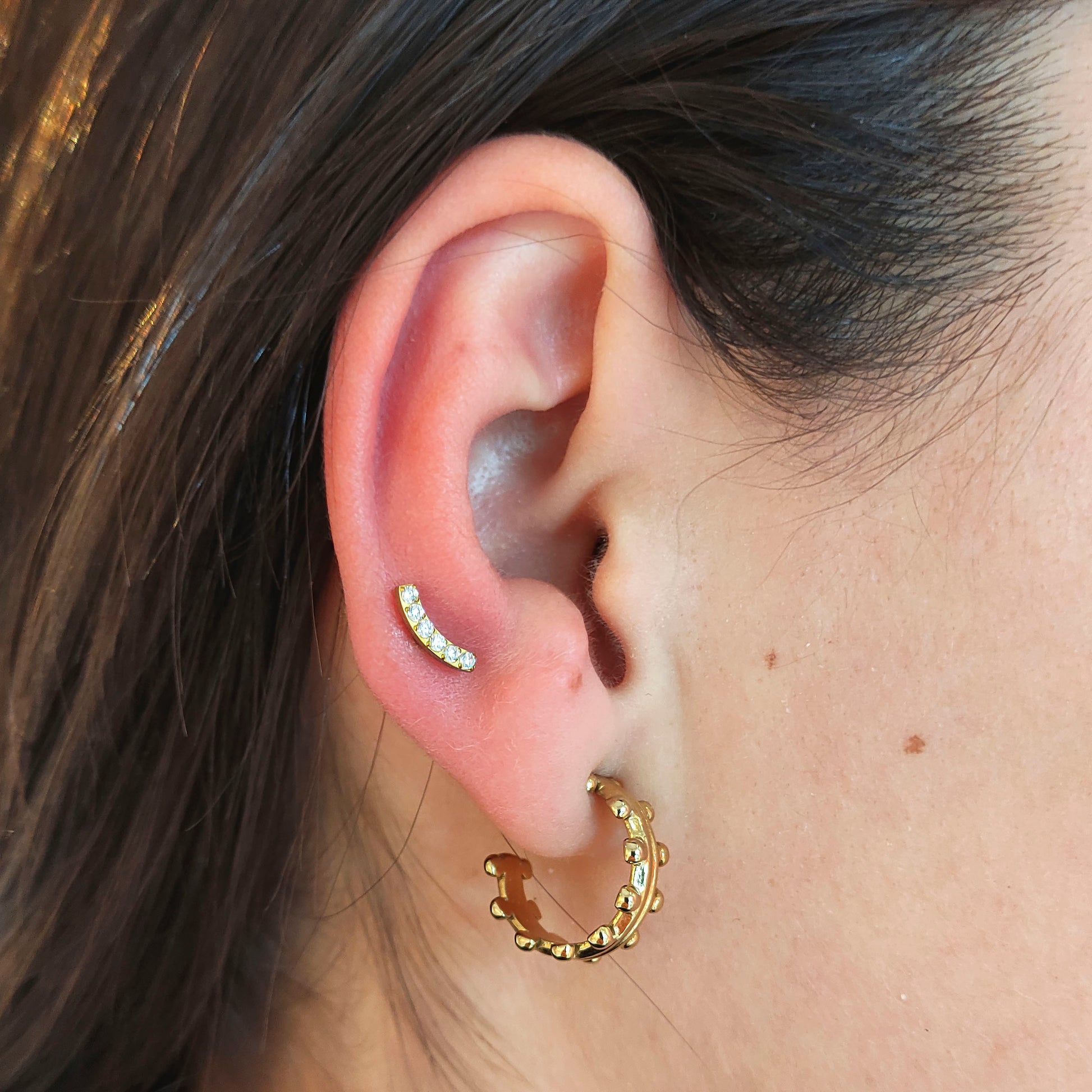 Esta pieza con seis circonitas incrustadas sigue suavemente la forma del hélix, pero también queda increíble en el conch o el lóbulo. Pensado para llevar a diario gracias a su estructura de Titanio Certificado con rosca interna y base plana. Está disponible en color dorado y plateado.