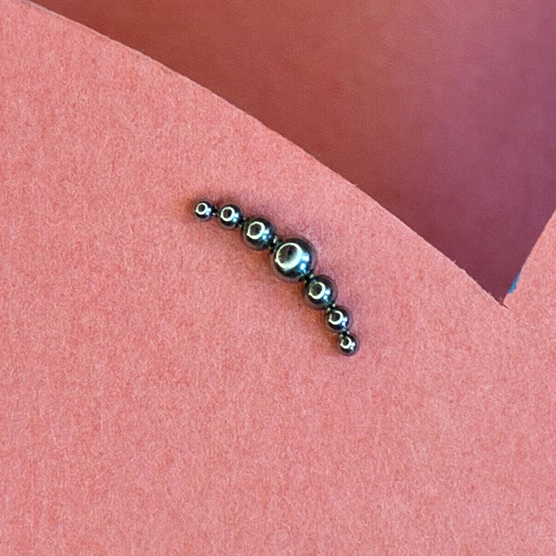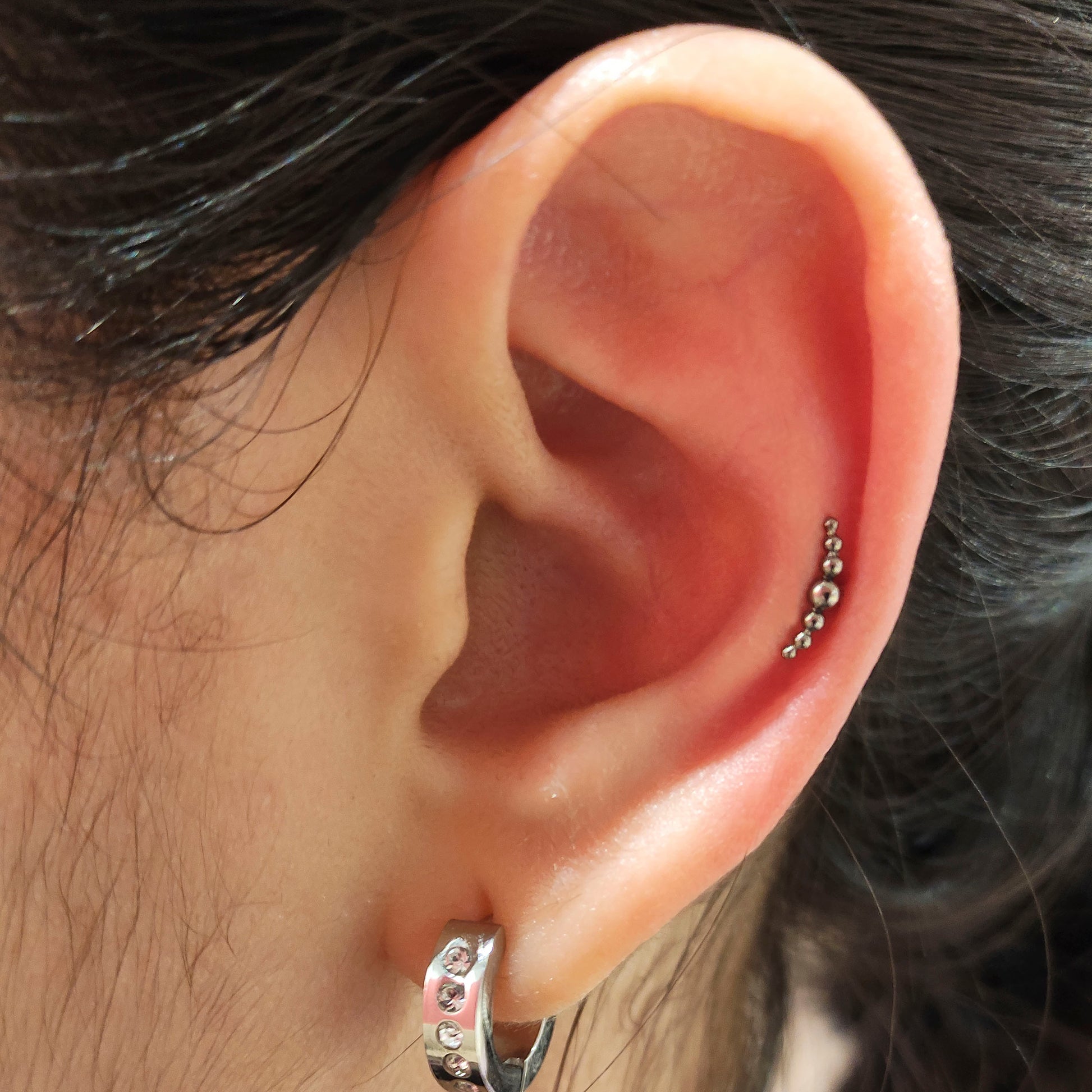 A delicate, minimalist design made of tiny beads arranged in a soft curved shape. Perfect for the helix or the lobe, following the natural contour of the ear. Made of certified implant-grade titanium, safe for sensitive skin and comfortable for long-term wear. Available in gold and silver.