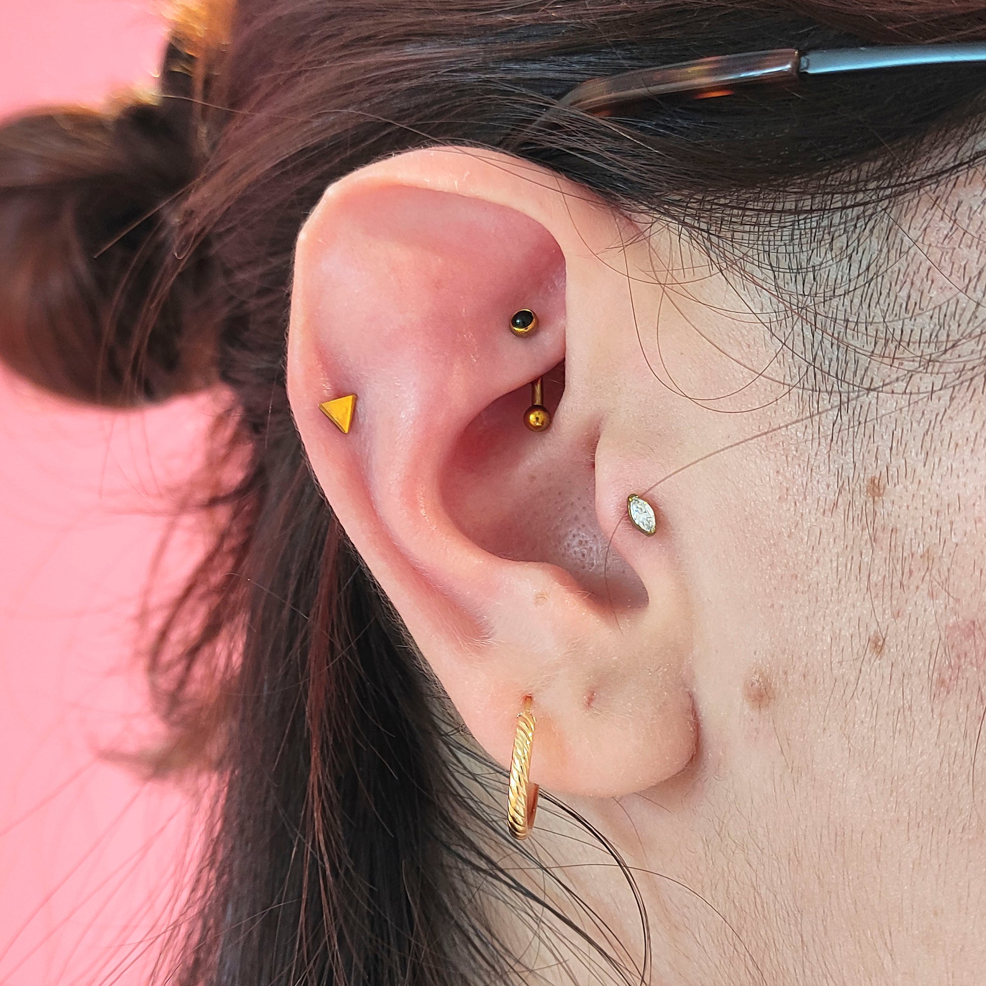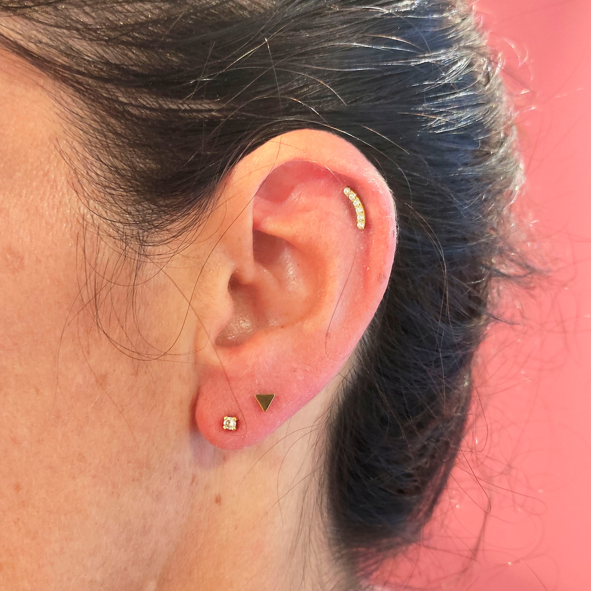 The Triangle piece adds a modern and elegant touch effortlessly. Its completely flat design makes it very comfortable to wear all day long. It won't get caught up in hair or clothing and looks great on the lobe, helix or flat. Made of certified titanium with internal threading and available in gold and silver.
