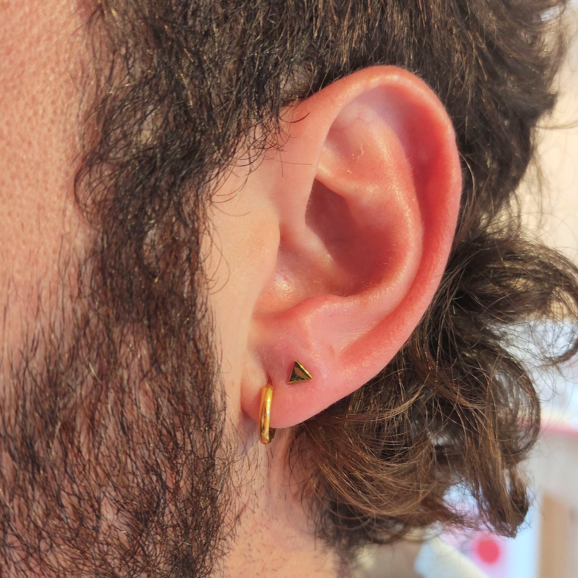 La pieza Triángulo aporta un toque moderno y elegante sin esfuerzo. Su diseño completamente plano la hace muy cómoda para llevar durante todo el día. No se engancha y queda ideal en lóbulo, hélix o flat. Fabricada en titanio certificado con rosca interna y disponible en dorado y plateado.